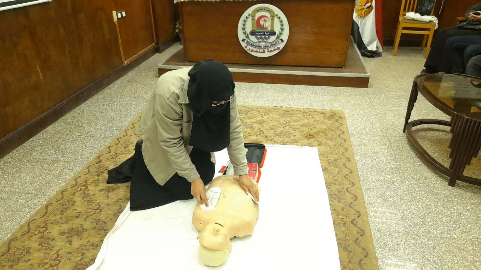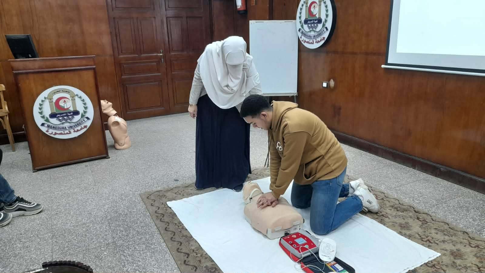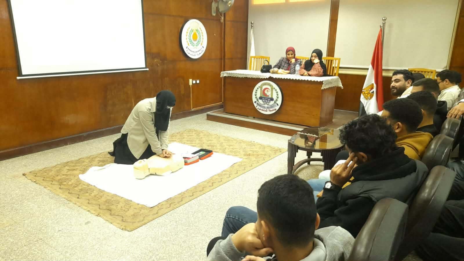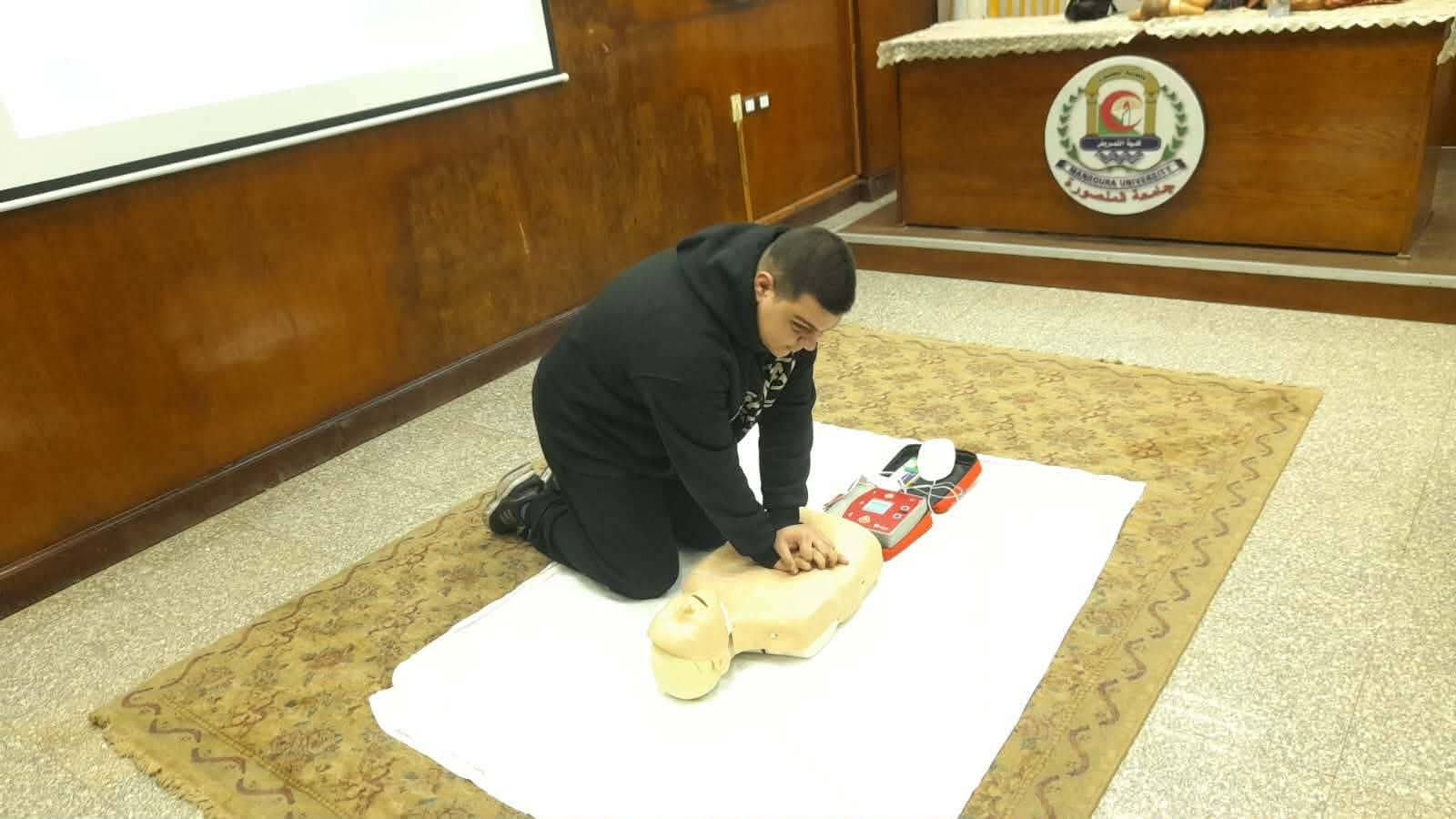 تم عقد برنامج تدريبي عن الاسعافات الاوليه لمجموعة من الطلاب و الخريجين بقاعة المؤتمرات بالكلية وتم التدريب علي الانعاش القلبي الرئوي