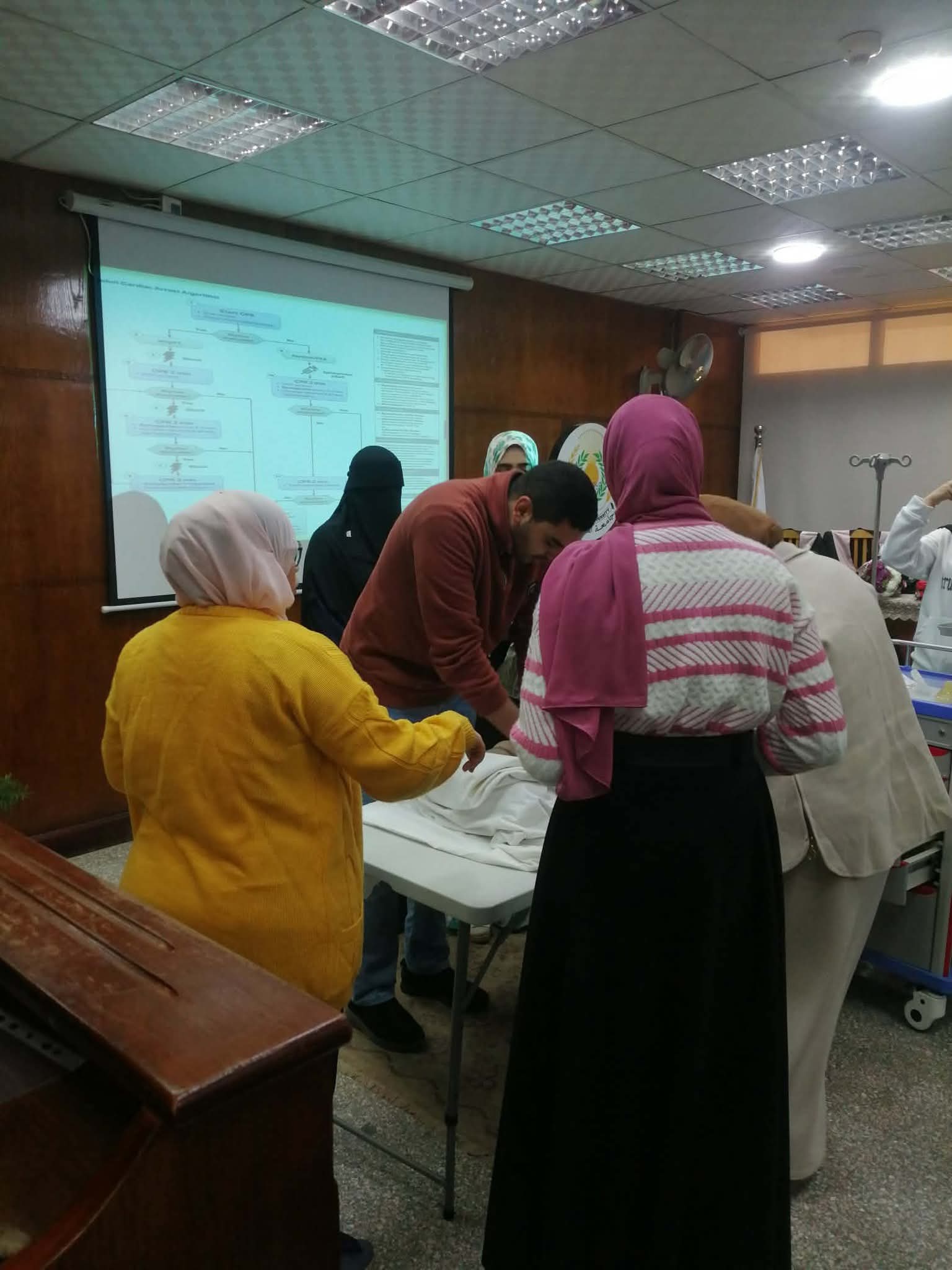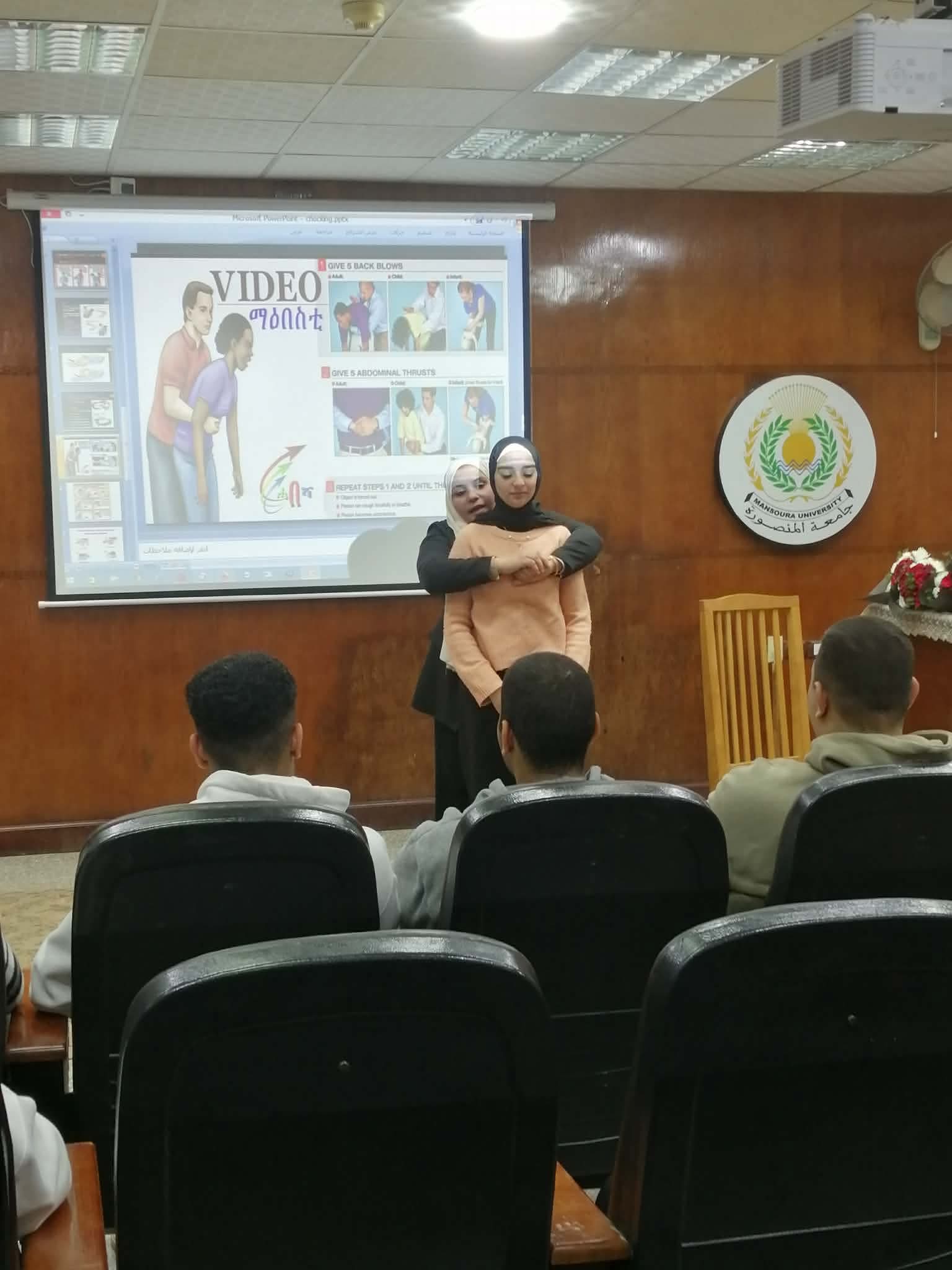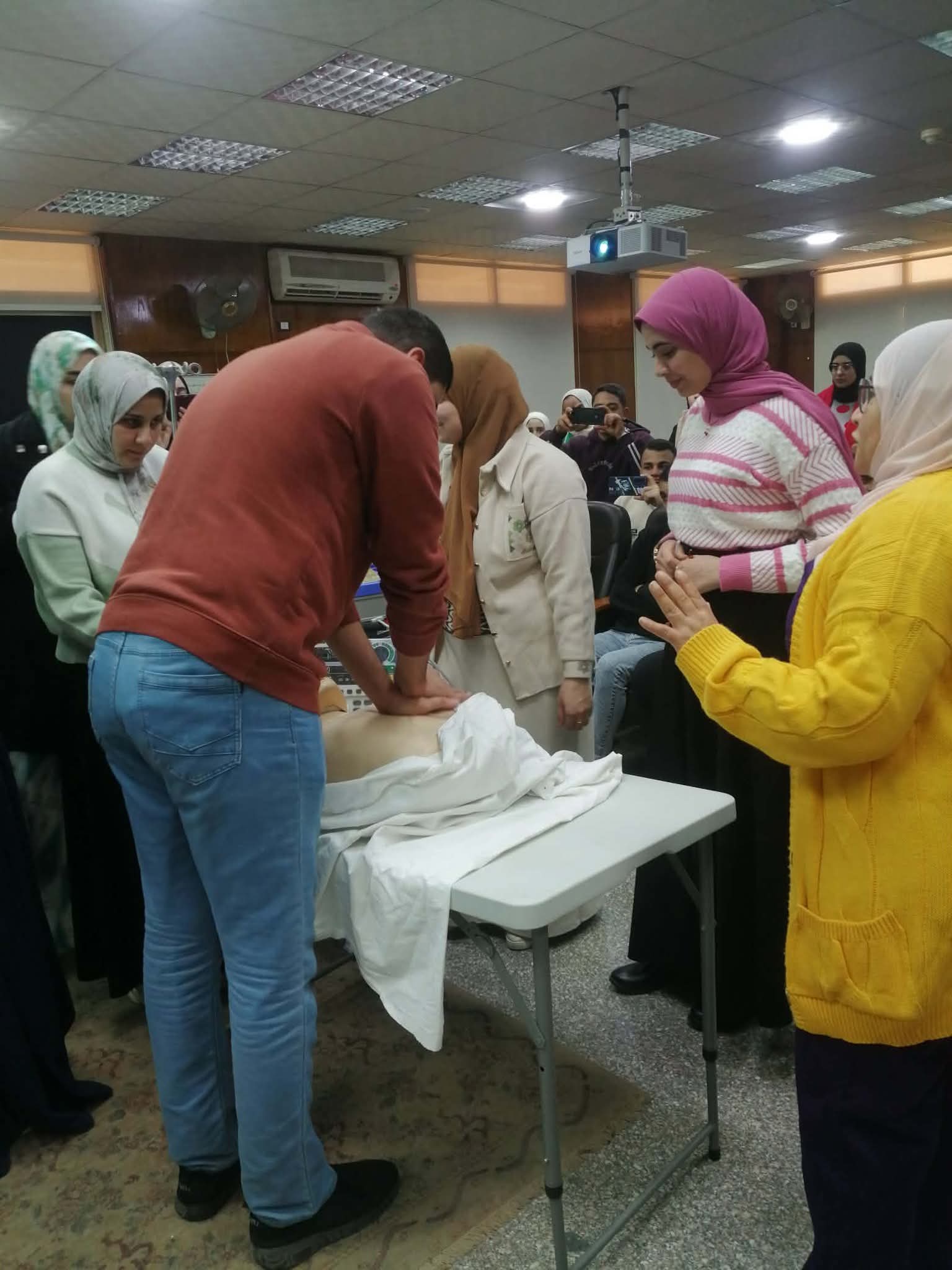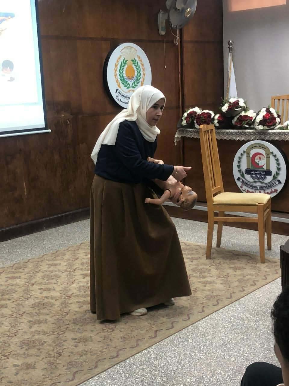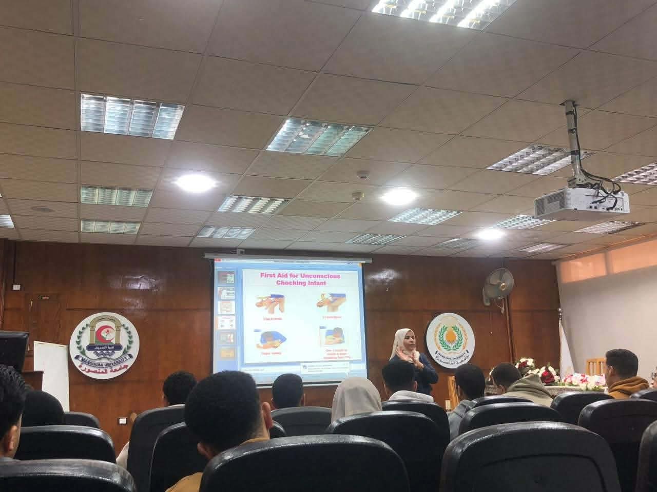 تم عقد برنامج تدريبي عن الاسعافات الاوليه لمجموعة من الطلاب و الخريجين بقاعة المؤتمرات بالكلية وتم التدريب علي الانعاش القلبي الرئوي