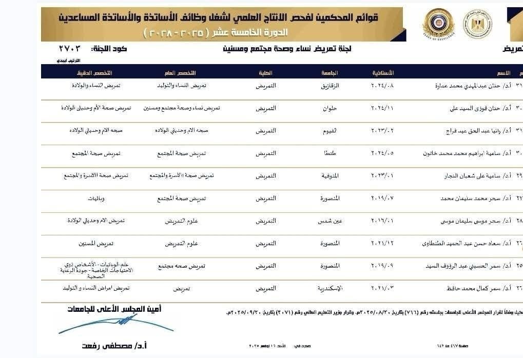 يتقدم قسم تمريض المسنين _جامعة المنصورة برئاسة ا.د / هبه نصحي عبد العزيز وجميع أعضاء القسم بخالص التهنئة للأستاذ الدكتور/ سعاد حسن عبد الحميد طنطاوي- عميد كلية التمريض جامعة المنصورة الجديدة، أستاذ تمريض المسنين لإختيار سيادتها ضمن قوائم المحكمين لفحص الإنتاج العلمى لشغل وظائف الأساتذة و الأساتذة المساعدين بالمجلس الأعلى للجامعات (الدورة الخامسة عشر ٢٠٢٥-٢٠٢٨).