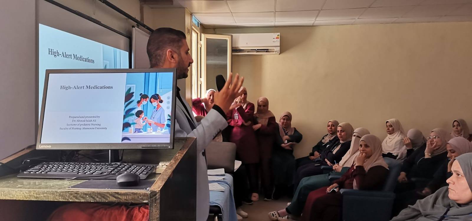 As part of the GAHAR accreditation indicators, the College of Nursing at Mansoura University held an introductory lecture on high‑alert medications.