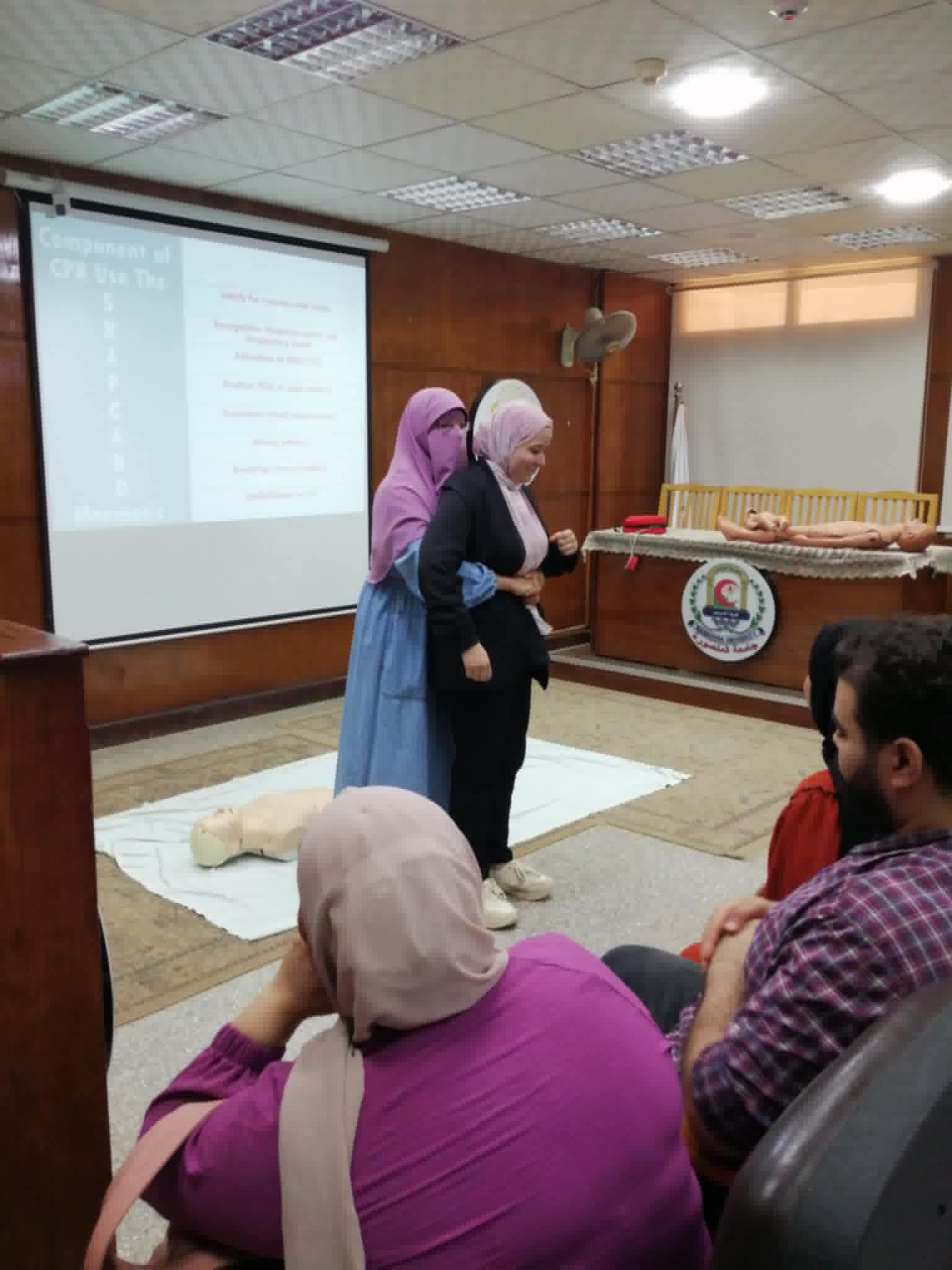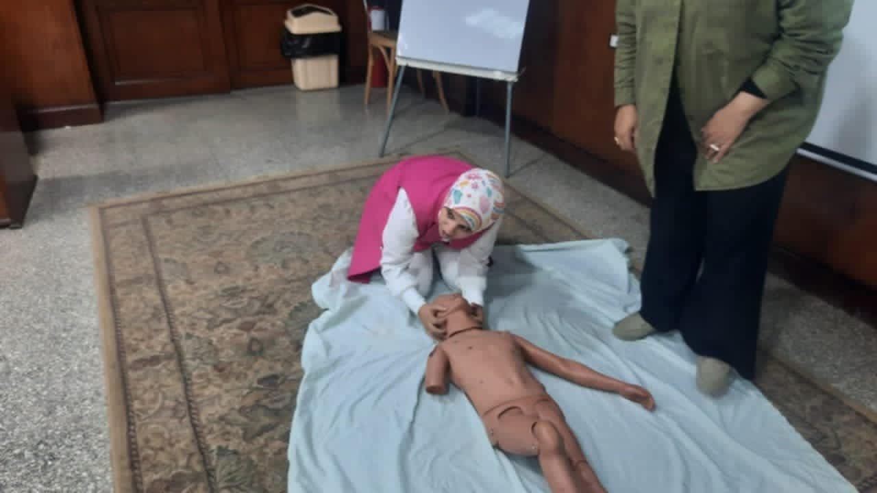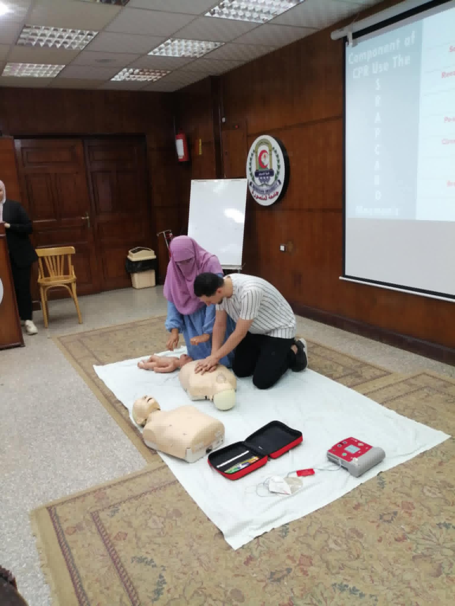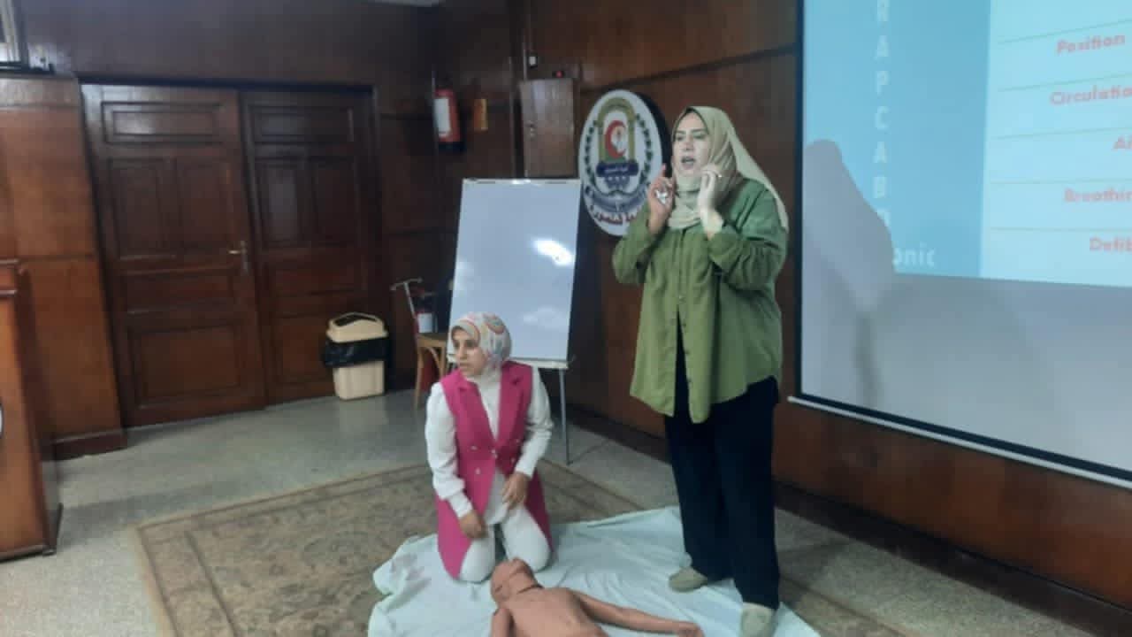 تم عقد برنامج تدريبي عن الإسعافات الأولية لهيئه التمريض بمستشفي الباطنه التخصصي بقاعة المؤتمرات بالكلية وتم التدريب علي الانعاش القلبي الرئوي واستمر التدريب لمده يومان :-