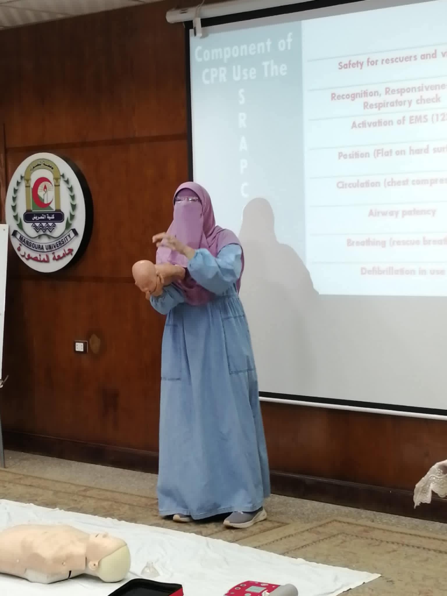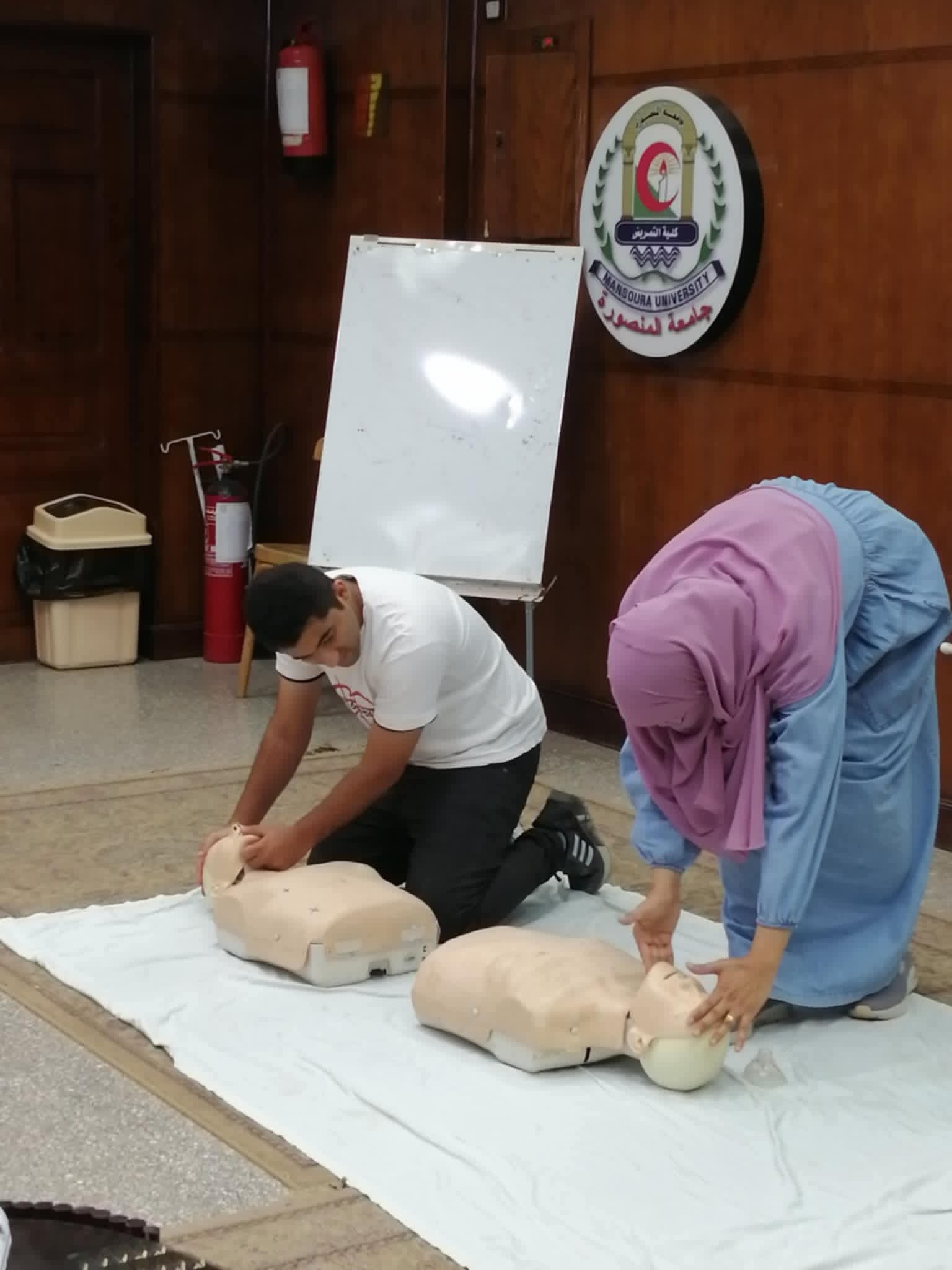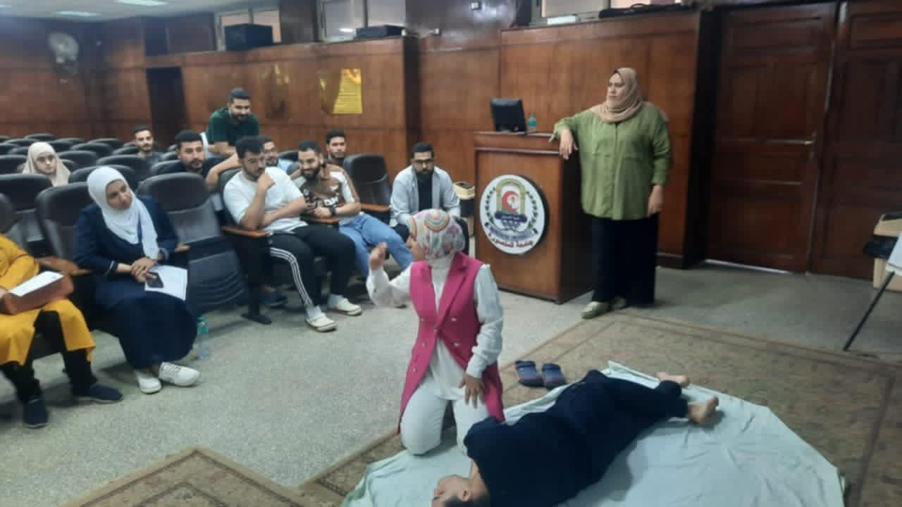 تم عقد برنامج تدريبي عن الإسعافات الأولية لهيئه التمريض بمستشفي الباطنه التخصصي بقاعة المؤتمرات بالكلية وتم التدريب علي الانعاش القلبي الرئوي واستمر التدريب لمده يومان :-