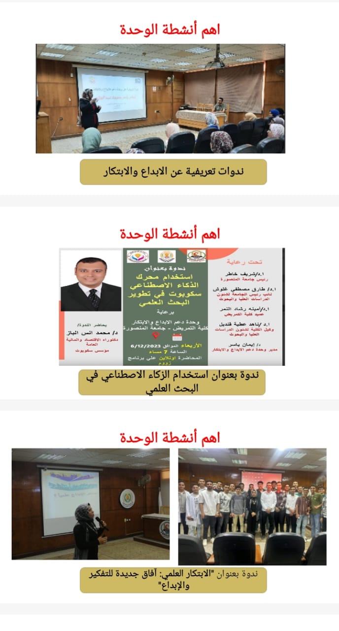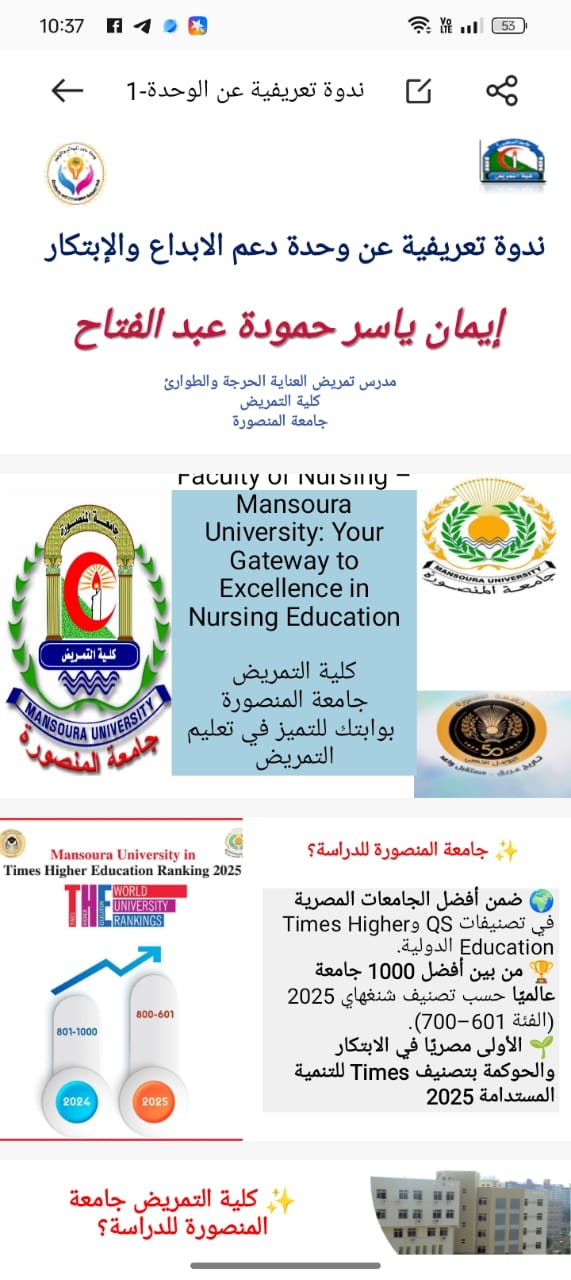 • وقام بتقديمها د/ إيمان ياسر – مدير وحدة الإبداع والابتكار بكلية التمريض ونواب الوحدة د مصطفي شوقي و د إيمان رشاد و د ايه ميمي.