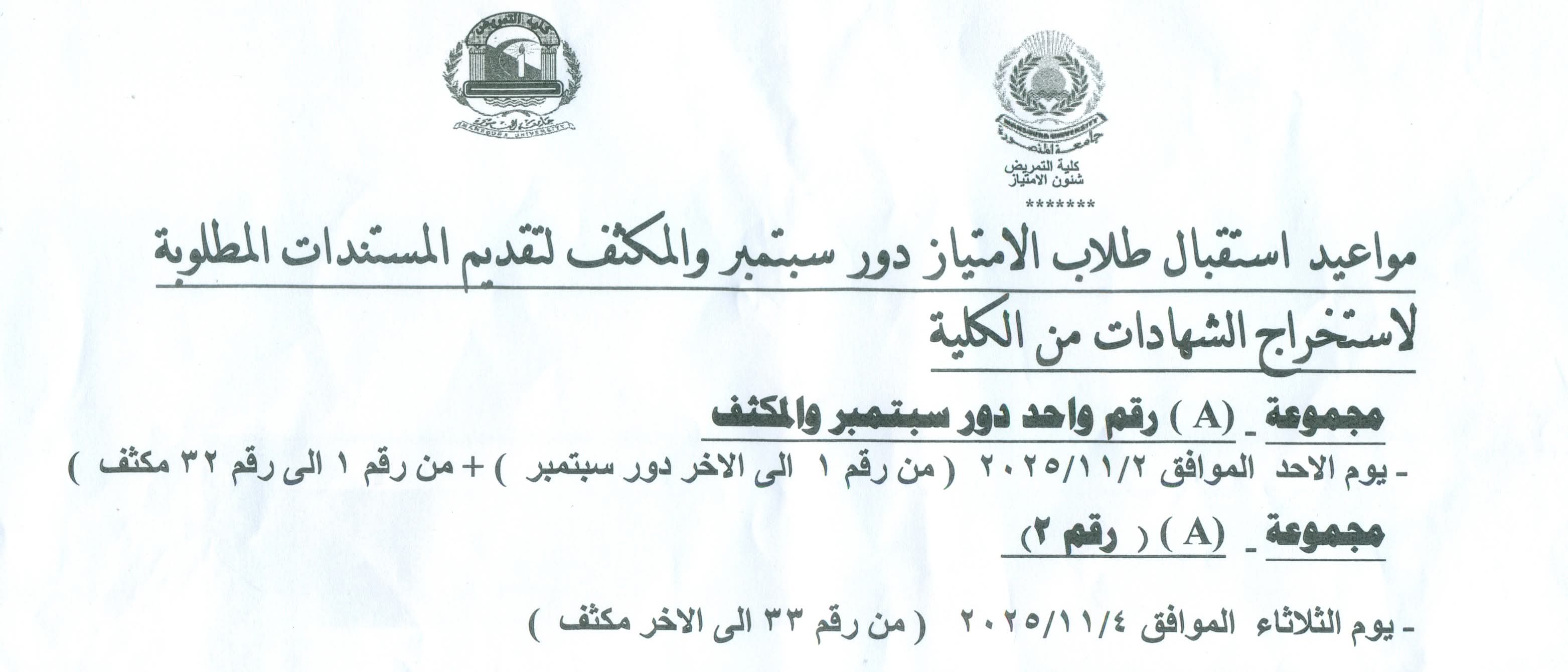 مواعيد إستقبال طلاب دور سبتمبر وطلاب المكثف لإستقبال طلبات استخراج الشهادات من الكلية مواعيد استقبال طلاب دور سبتمبر وطلاب المكثف لإستقبال طلبات استخراج الشهادات من الكلية