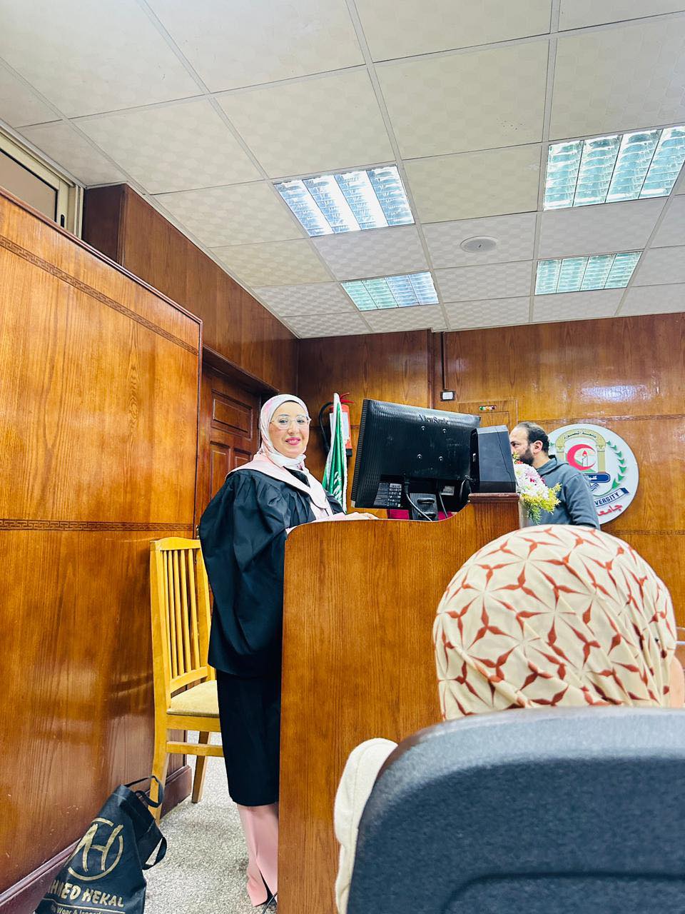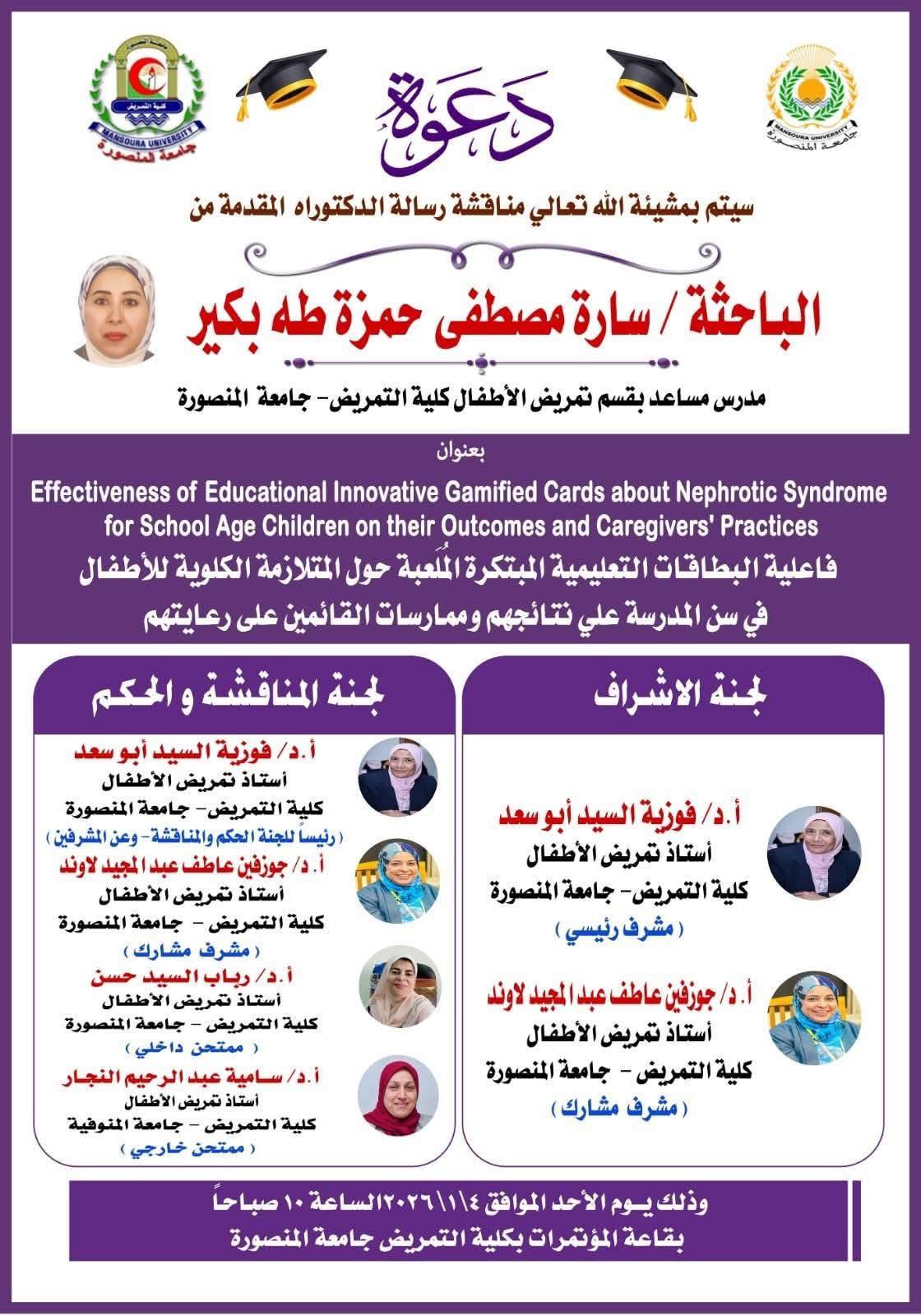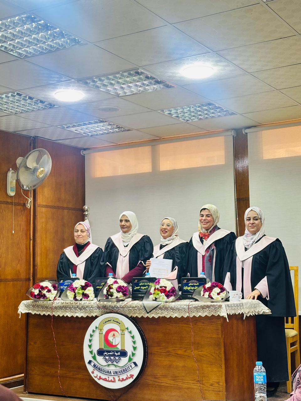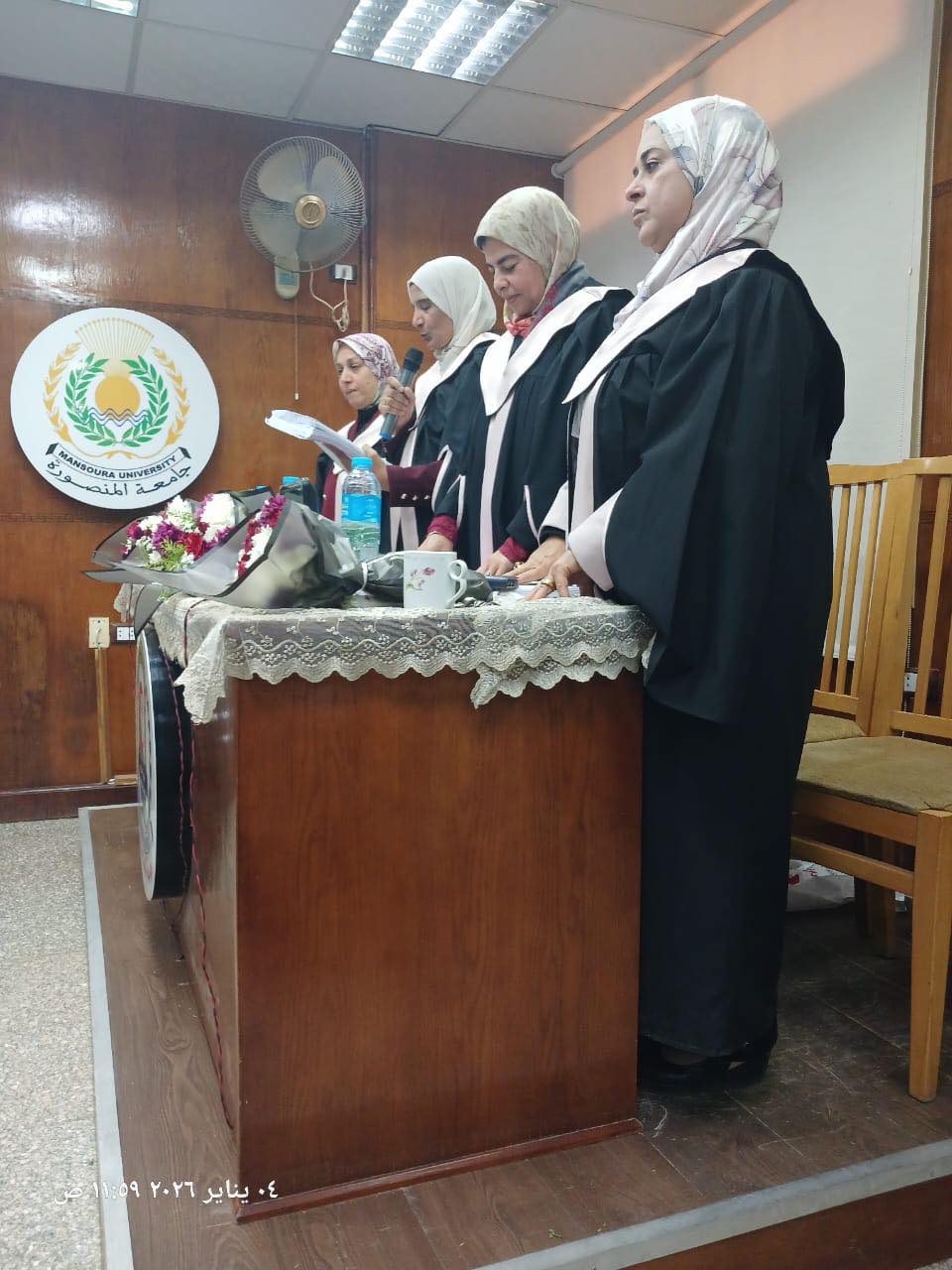 وقد أُجريت المناقشة يوم الأحد الموافق ٤ / ١٢ / ٢٠٢٦ في قاعة المؤتمرات بكلية التمريض – جامعة المنصورة،